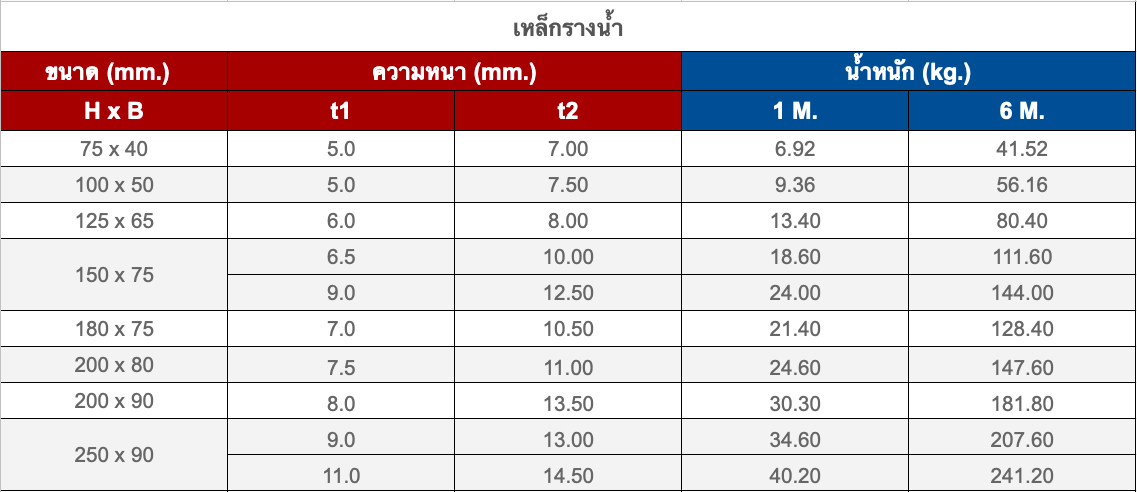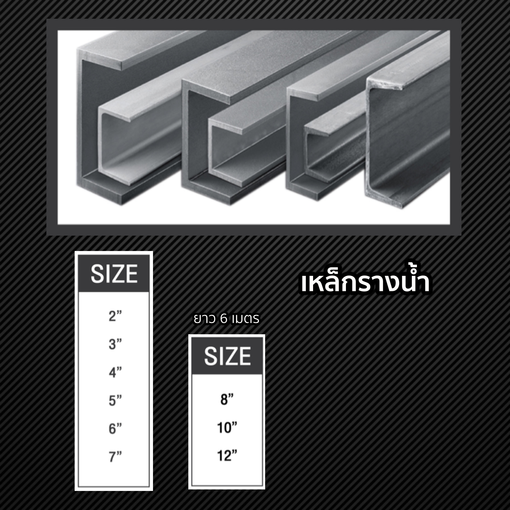 เหล็กรางน้ำ (สำหรับงานบันได งานแปต่างๆ งานโครงสร้างบ้าน หลังคาโรงงาน) มีหน้าตัดเป็นรูปตัวยู (U) นิยมใช้งานบันได งานแปต่างๆ งานโครงสร้างบ้าน หลังคาโรงงาน